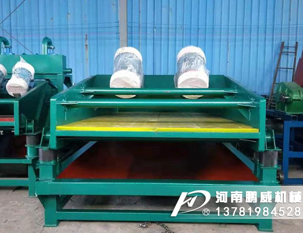 主要由篩箱、激振器、支承系統及電機組成。兩個互不聯系的振動器作同步反向運轉,兩組偏心質量產生的離心力沿振動方向的分力疊加,反向離心抵消,從而形成單一的沿振動方向的激振動,使篩箱做作往復直線運動。