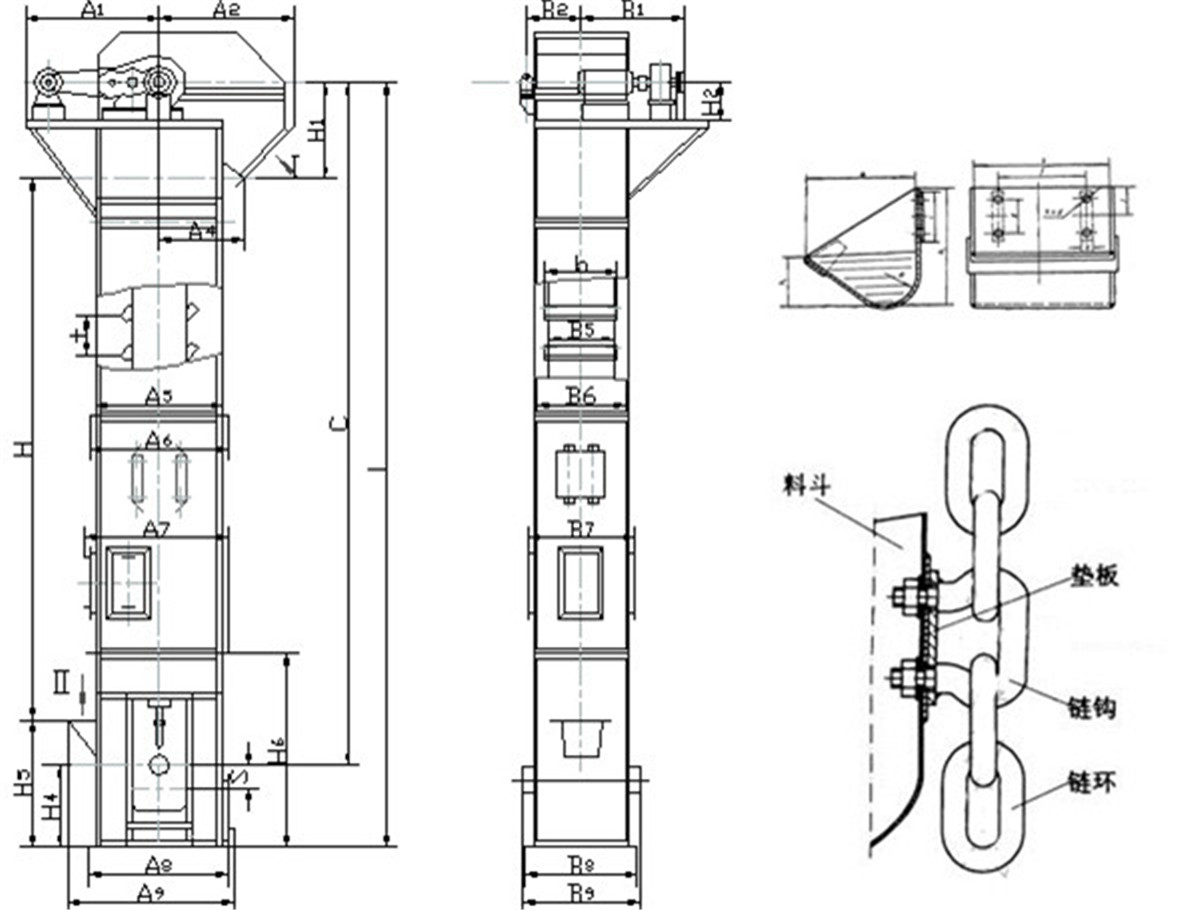 環(huán)鏈斗式提升機(jī)由運動部分(料斗與牽引鏈條)、帶有傳動鏈輪的上部區(qū)段、帶有拉緊輪的下部區(qū)段、中間機(jī)殼、驅(qū)動裝置、逆止制動裝置等組成。本提升機(jī)的料斗為間斷式布置,利用“掏取法”進(jìn)行裝載,“離心投料法”卸料。本斗式提升機(jī)的牽引機(jī)構(gòu)是兩根環(huán)形鏈條.我公司生產(chǎn)的環(huán)鏈斗式提升機(jī),由運動部分(料斗與牽引鏈條)、帶有傳動鏈輪的上部區(qū)段、帶有拉緊輪的下部區(qū)段、中間機(jī)殼、驅(qū)動裝置、逆止制動裝置等組成。本提升機(jī)的料斗為間斷式布置,利用“掏取法”進(jìn)行裝載,“離心投料法”卸料。本斗式提升機(jī)的牽引機(jī)構(gòu)是兩根環(huán)形鏈條。